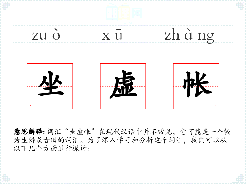 词汇“坐虚帐”在现代汉语中并不常见,它可能是一个较为生僻或古旧的词汇。为了深入学*和分析这个词汇,我们可以从以下几个方面进行探讨: