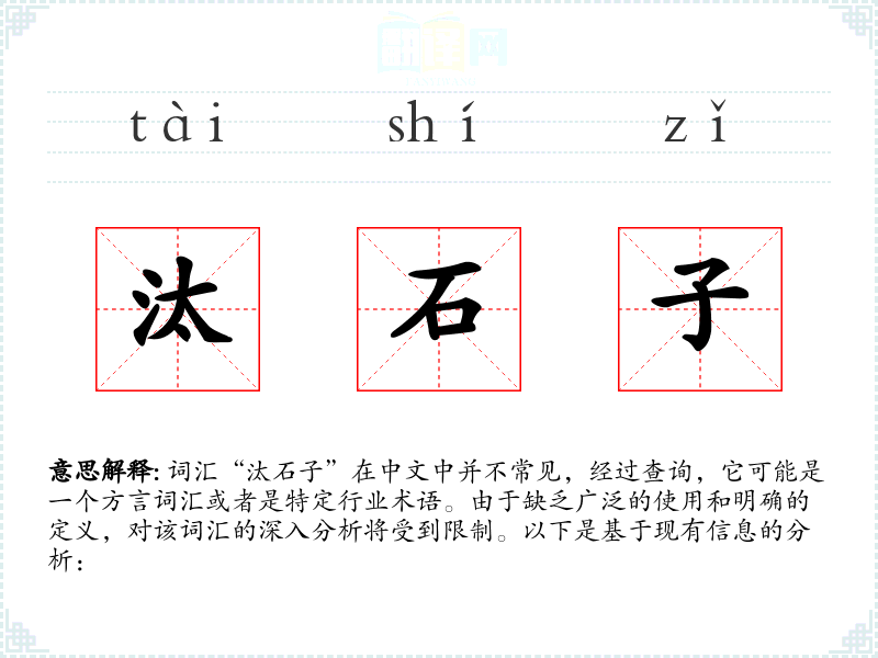 词汇“汰石子”在中文中并不常见,经过查询,它可能是一个方言词汇或者是特定行业术语。由于缺乏广泛的使用和明确的定义,对该词汇的深入分析将受到限制。以下是基于现有信息的分析: