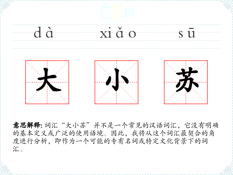 由于“大小苏”不是一个标准词汇,它可能是一个特定地区或社群中使用的俚语、昵称或专有名词。字面意思可能是指两个名字中包含“苏”的人,其中一个被称作“大苏”,另一个被称作“小苏”。