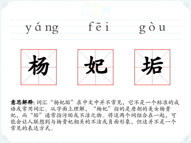 - 同义词:可能包括“杨妃污”、“杨妃秽”等,但这些都不是常用词汇。