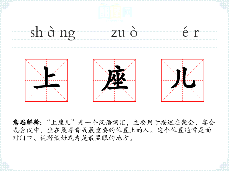 - 口语:在日常口语中,这个词汇常用来指代某个场合中最受尊敬的位置,如“今晚的聚会上,王老师坐在了上座儿。”