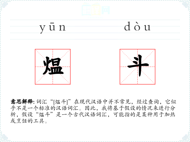 词汇“[煴斗]”在现代汉语中并不常见,经过查询,它似乎不是一个标准的汉语词汇。因此,我将基于假设的情况来进行分析,假设“煴斗”是一个古代汉语词汇,可能指的是某种用于加热或烹饪的工具。