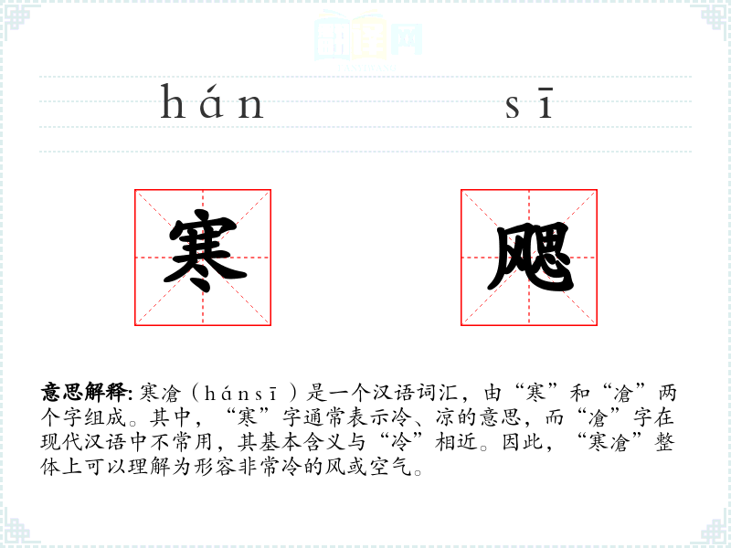 寒凔(hán sī)是一个汉语词汇,由“寒”和“凔”两个字组成。其中,“寒”字通常表示冷、凉的意思,而“凔”字在现代汉语中不常用,其基本含义与“冷”相近。因此,“寒凔”整体上可以理解为形容非常冷的风或空气。
