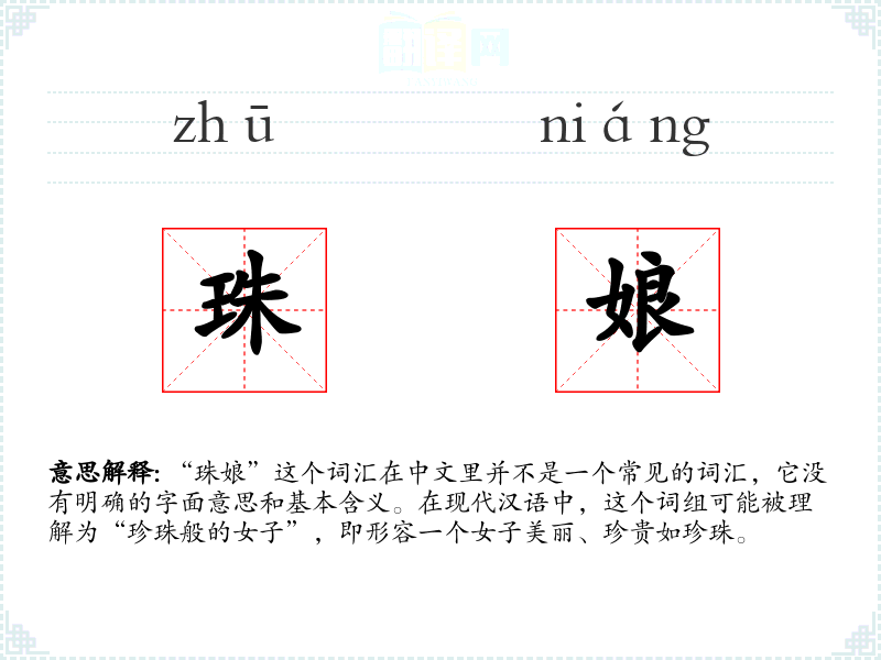 - 反义词:无(由于“珠娘”不是一个常用词汇,很难找到直接的反义词)