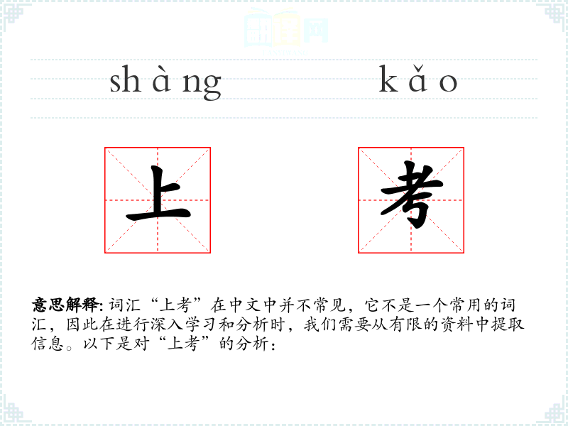由于“上考”不是一个常用词汇,它在现代汉语中的使用非常有限。在古代文献或特定的专业领域(如历史研究)中,可能会出现这个词,用以描述对历史人物或**的深入考察。