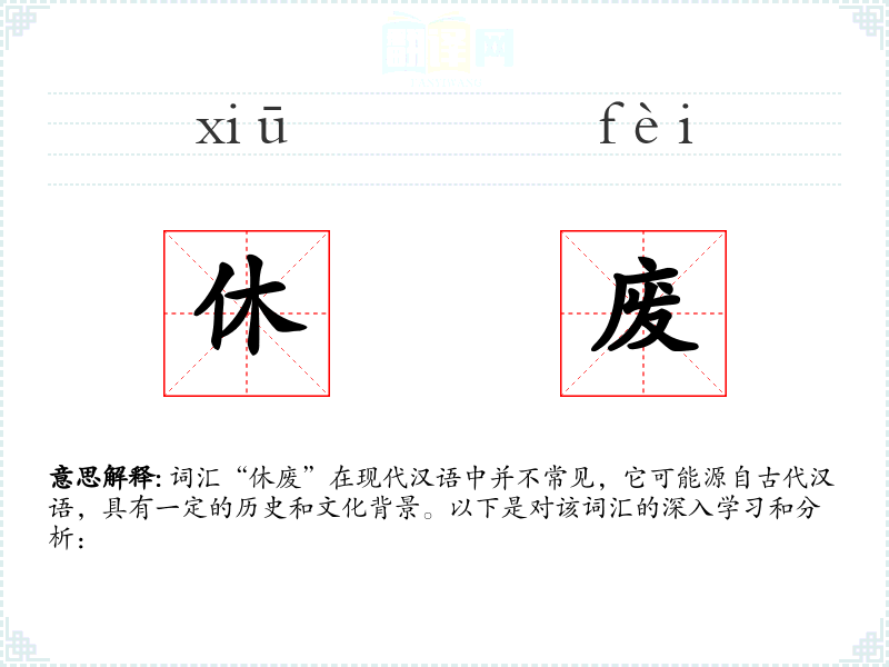 词汇“休废”在现代汉语中并不常见,它可能源自古代汉语,具有一定的历史和文化背景。以下是对该词汇的深入学*和分析: