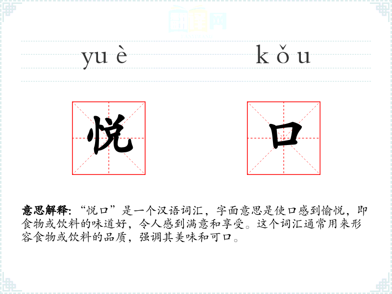 “悦口”是一个汉语词汇,字面意思是使口感到愉悦,即食物或饮料的味道好,令人感到满意和享受。这个词汇通常用来形容食物或饮料的品质,强调其美味和可口。
