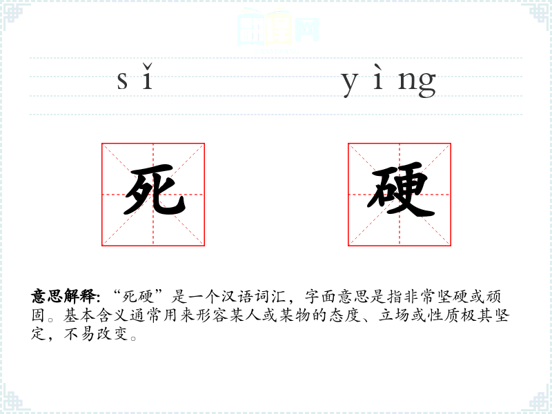 “死硬”是一个汉语词汇,字面意思是指非常坚硬或顽固。基本含义通常用来形容某人或某物的态度、立场或性质极其坚定,不易改变。
