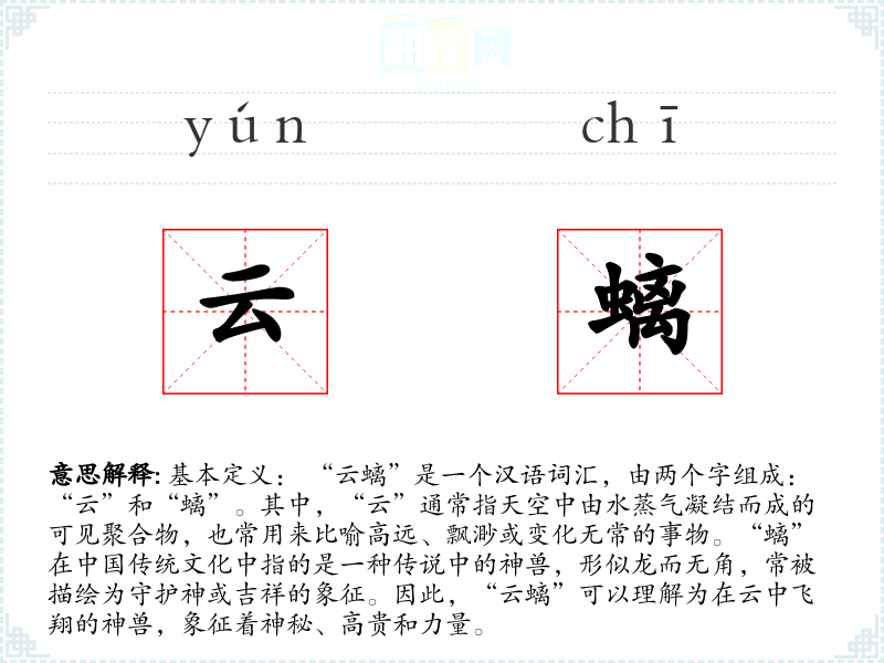 语境分析: 在文学作品中,“云螭”常被用来形容壮丽的景象或表达对超凡脱俗境界的向往。在口语中,这个词汇可能不太常用,但在特定的文化或艺术讨论中,它可能会被提及。在专业领域,如古代神话研究或艺术史中,“云螭”可能会被详细探讨其象征意义和文化背景。