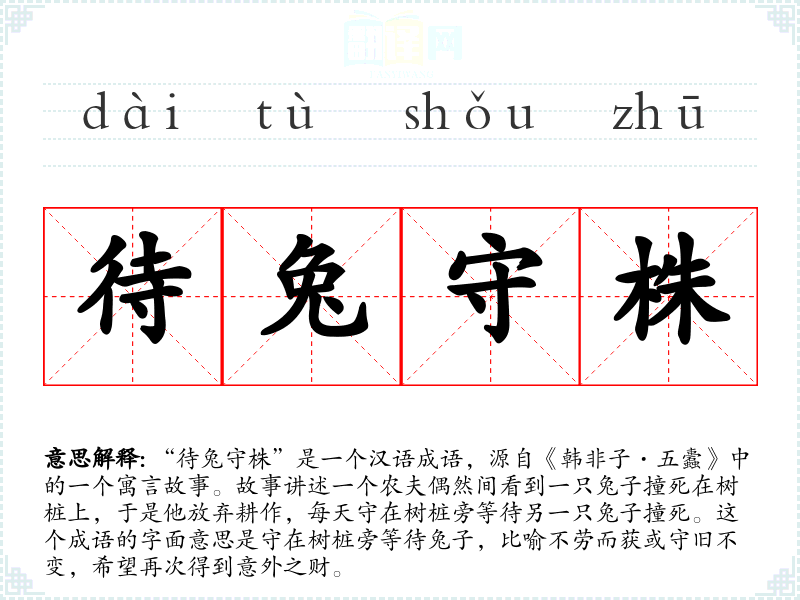 “待兔守株”是一个汉语成语,源自《韩非子·五蠹》中的一个寓言故事。故事讲述一个农夫偶然间看到一只兔子撞死在树桩上,于是他放弃耕作,每天守在树桩旁等待另一只兔子撞死。这个成语的字面意思是守在树桩旁等待兔子,比喻不劳而获或守旧不变,希望再次得到意外之财。