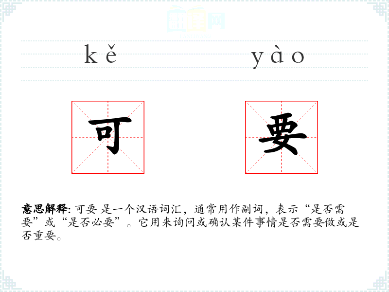 可要 是一个汉语词汇,通常用作副词,表示“是否需要”或“是否必要”。它用来询问或确认某件事情是否需要做或是否重要。