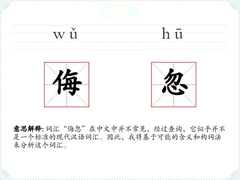 词汇“侮忽”在中文中并不常见,经过查询,它似乎并不是一个标准的现代汉语词汇。因此,我将基于可能的含义和构词法来分析这个词汇。