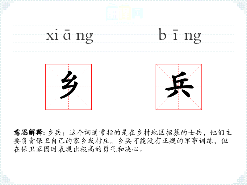 乡兵:这个词通常指的是在乡村地区招募的士兵,他们主要负责保卫自己的家乡或村庄。乡兵可能没有正规的军事训练,但在保卫家园时表现出极高的勇气和决心。