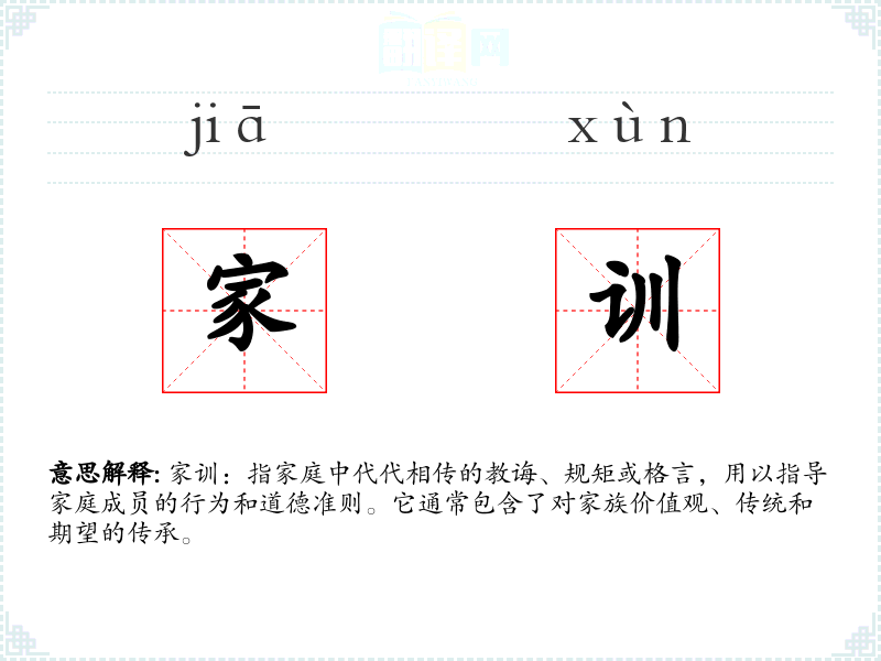 - 反义词:无(家训通常是正面的指导原则,不易找到直接的反义词)