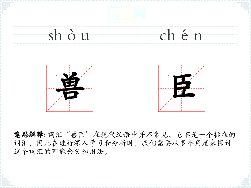 由于“兽臣”不是一个常用词汇,它在不同的语境下可能会有不同的解释。在文学作品中,它可能被用来形容一个性格凶猛、行为野蛮的角色。在口语或日常对话中,这个词汇可能不太会被使用,除非是在特定的文学或历史讨论中。