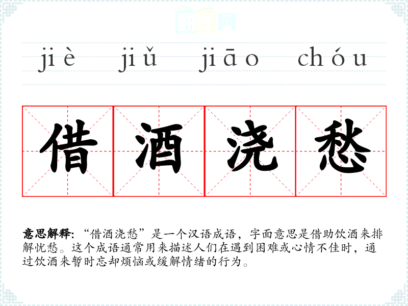 “借酒浇愁”是一个汉语成语,字面意思是借助饮酒来排解忧愁。这个成语通常用来描述人们在遇到困难或心情不佳时,通过饮酒来暂时忘却烦恼或缓解情绪的行为。