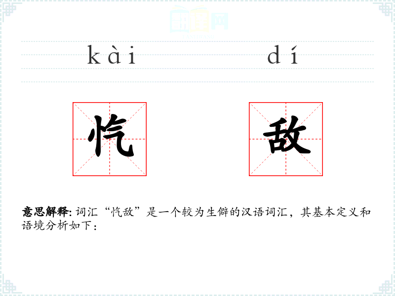 词汇“忾敌”是一个较为生僻的汉语词汇,其基本定义和语境分析如下: