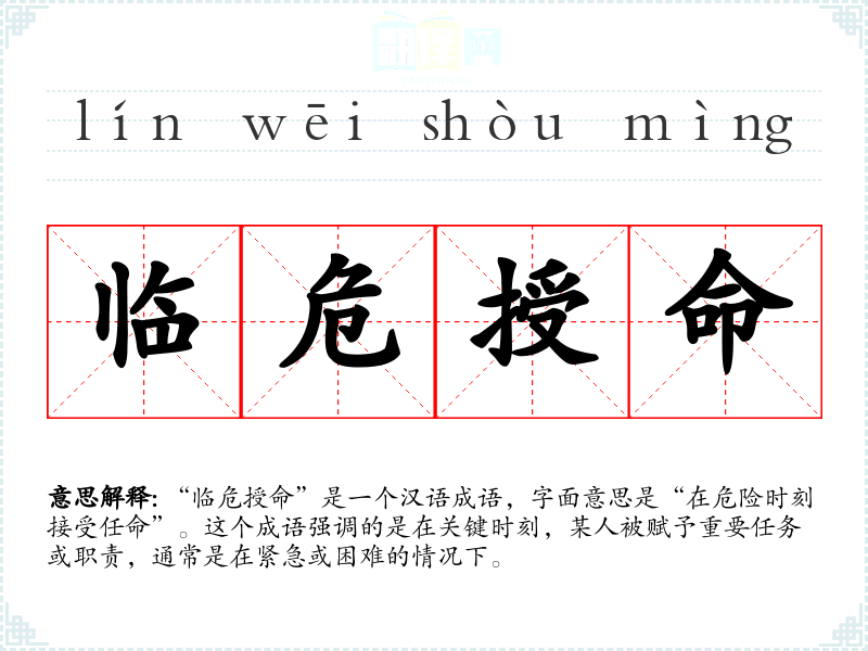 “临危授命”是一个汉语成语,字面意思是“在危险时刻接受任命”。这个成语强调的是在关键时刻,某人被赋予重要任务或职责,通常是在紧急或困难的情况下。