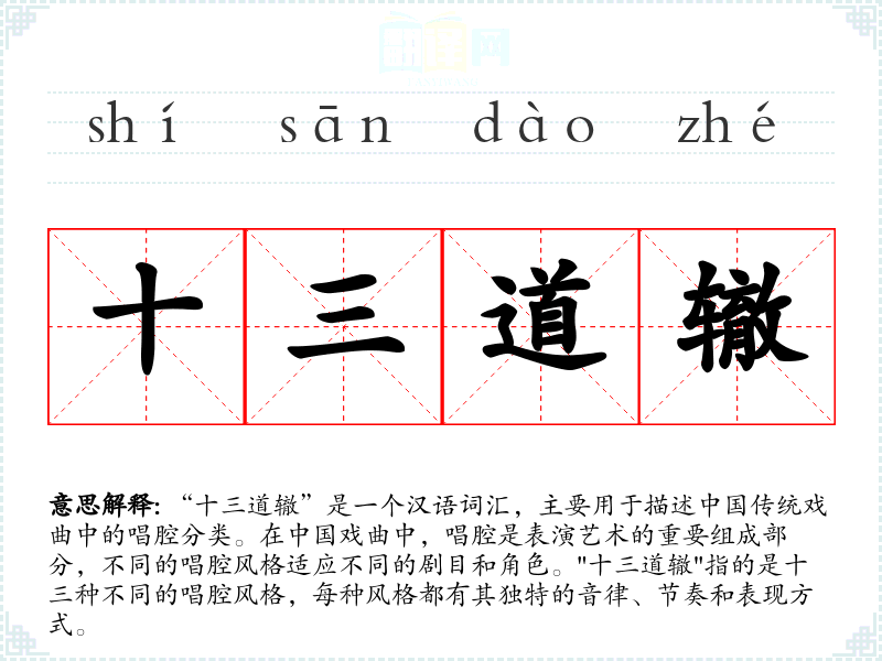 “十三道辙”是一个汉语词汇,主要用于描述传统戏曲中的唱腔分类。在戏曲中,唱腔是表演艺术的重要组成部分,不同的唱腔风格适应不同的剧目和角色。"十三道辙"指的是十三种不同的唱腔风格,每种风格都有其独特的音律、节奏和表现方式。