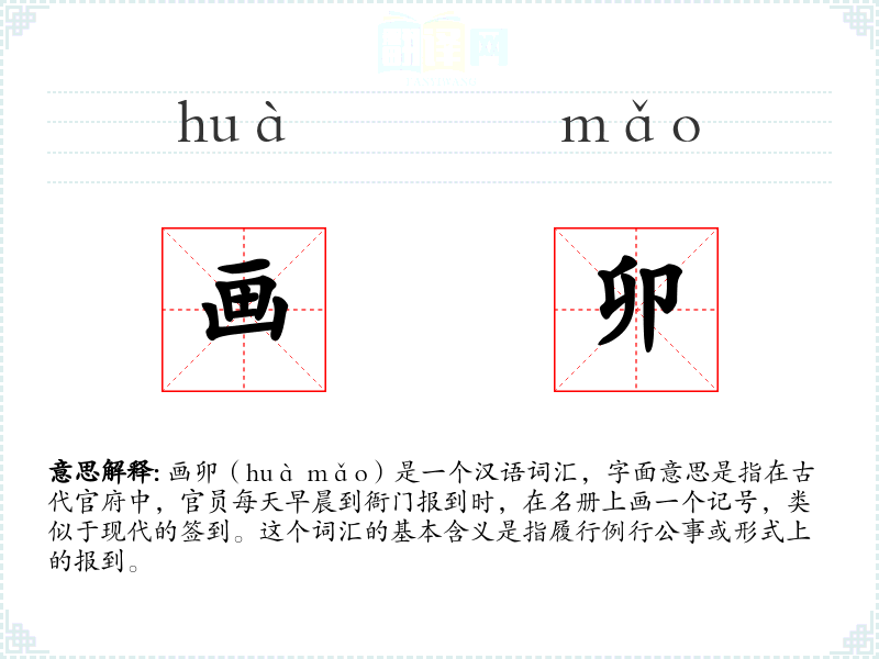 画卯(huà mǎo)是一个汉语词汇,字面意思是指在古代官府中,官员每天早晨到衙门报到时,在名册上画一个记号,类似于现代的签到。这个词汇的基本含义是指履行例行公事或形式上的报到。