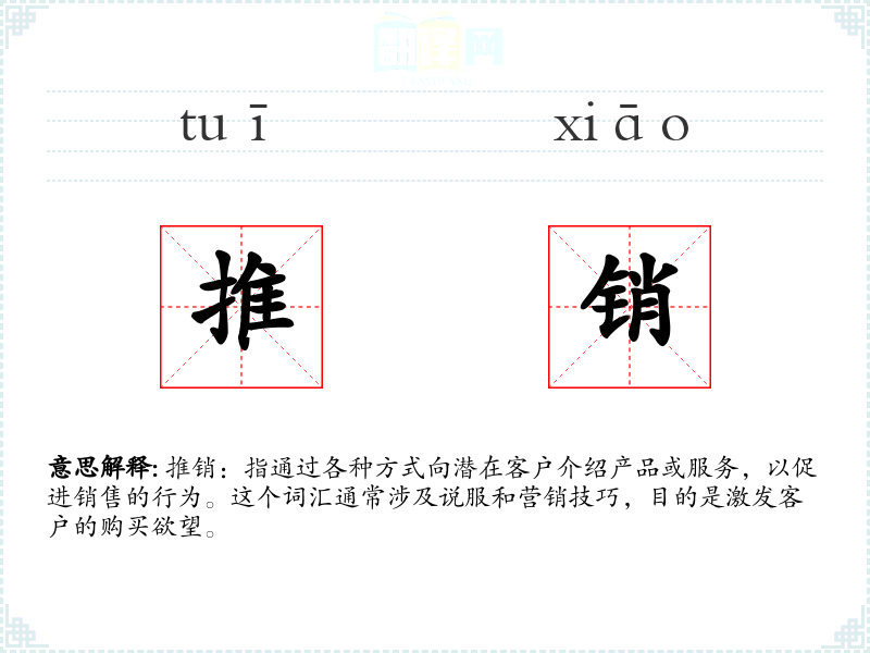 推销:指通过各种方式向潜在客户介绍产品或服务,以促进销售的行为。这个词汇通常涉及说服和营销技巧,目的是激发客户的购买欲望。