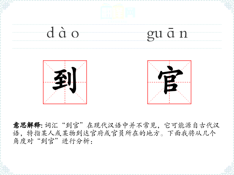 词汇“到官”在现代汉语中并不常见,它可能源自古代汉语,特指某人或某物到达官府或官员所在的地方。下面我将从几个角度对“到官”进行分析: