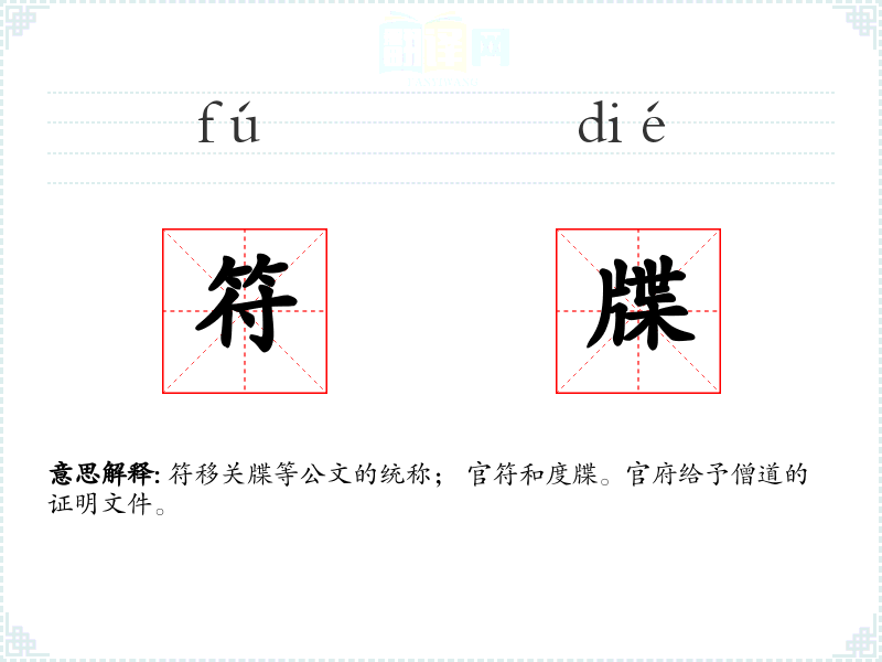 符移关牒等公文的统称; 官符和度牒。官府给予僧道的证明文件。