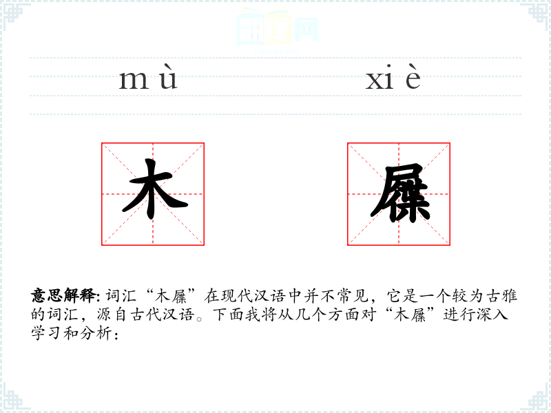 词汇“木屧”在现代汉语中并不常见,它是一个较为古雅的词汇,源自古代汉语。下面我将从几个方面对“木屧”进行深入学*和分析: