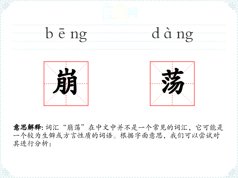 词汇“崩荡”在中文中并不是一个常见的词汇,它可能是一个较为生僻或方言性质的词语。根据字面意思,我们可以尝试对其进行分析: