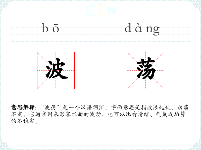 “波荡”是一个汉语词汇,字面意思是指波浪起伏、动荡不定。它通常用来形容水面的波动,也可以比喻情绪、气氛或局势的不稳定。