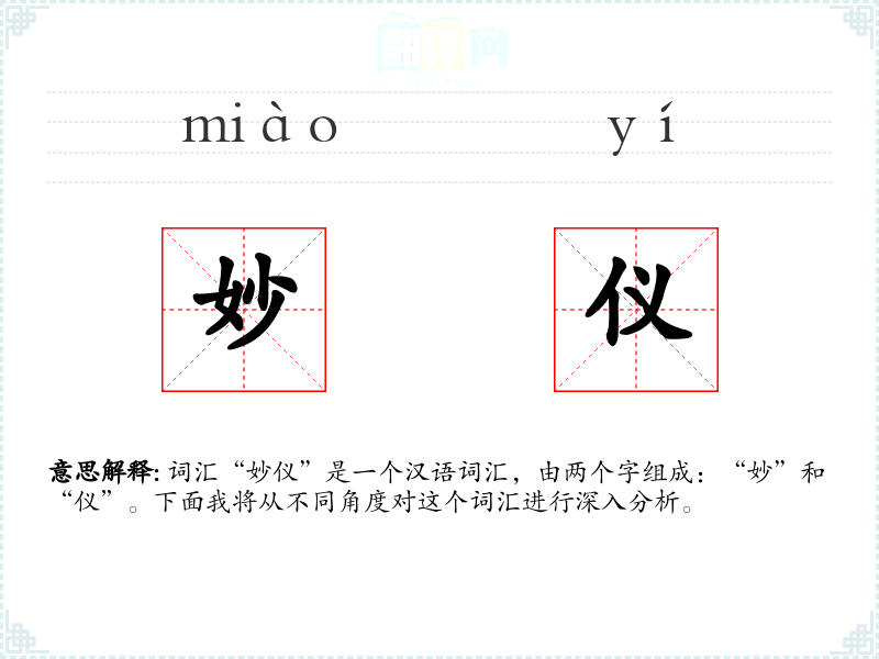 词汇“妙仪”是一个汉语词汇,由两个字组成:“妙”和“仪”。下面我将从不同角度对这个词汇进行深入分析。