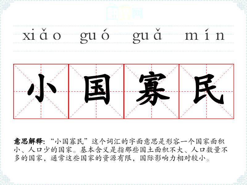 “小国寡民”这个词汇的字面意思是形容一个国家面积小、人口少的国家。基本含义是指那些国土面积不大、人口数量不多的国家,通常这些国家的资源有限,国际影响力相对较小。