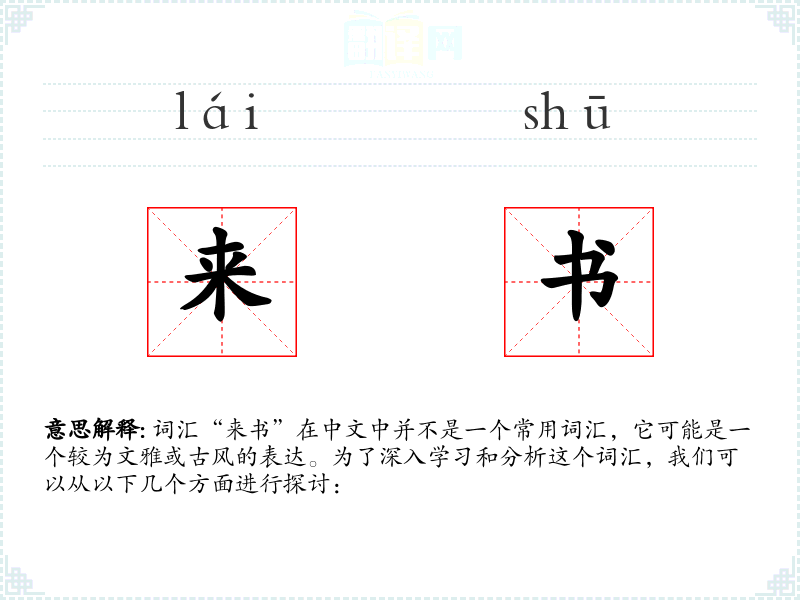 词汇“来书”在中文中并不是一个常用词汇,它可能是一个较为文雅或古风的表达。为了深入学*和分析这个词汇,我们可以从以下几个方面进行探讨:
