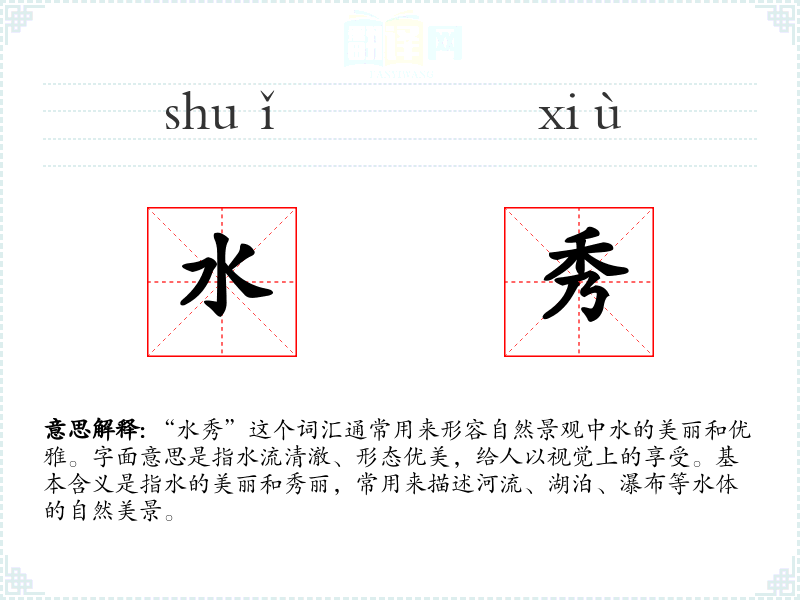 “水秀”这个词汇的词源较为简单,由“水”和“秀”两个字组成。在古代汉语中,“秀”字常用来形容美丽、优秀的事物。随着时间的推移,“水秀”逐渐被用来形容水的美丽和优雅,成为描述自然景观的常用词汇。