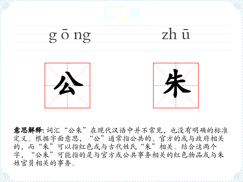 - 在某些历史小说中,“公朱”可能被用来描述与朱姓官员相关的公共事务。
