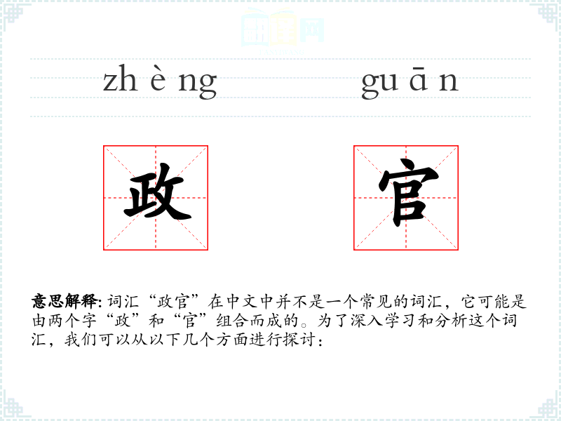 词汇“政官”在中文中并不是一个常见的词汇,它可能是由两个字“政”和“官”组合而成的。为了深入学*和分析这个词汇,我们可以从以下几个方面进行探讨: