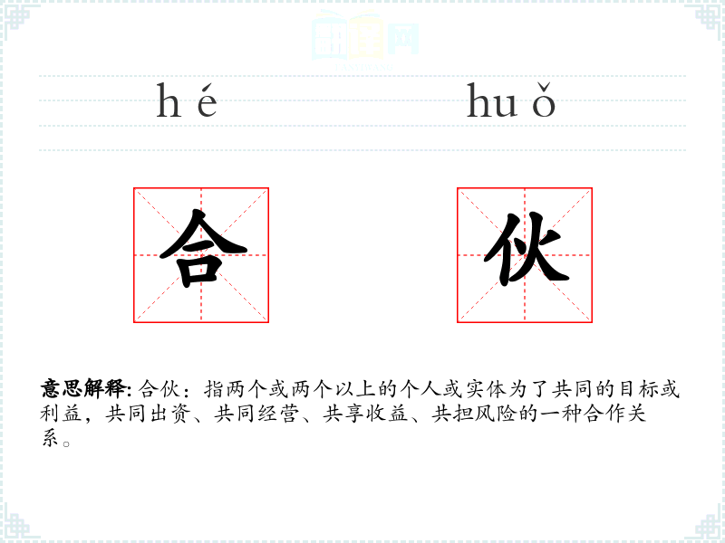 - 专业领域:在法律和商业领域,合伙指的是一种特定的商业组织形式,如合伙企业。