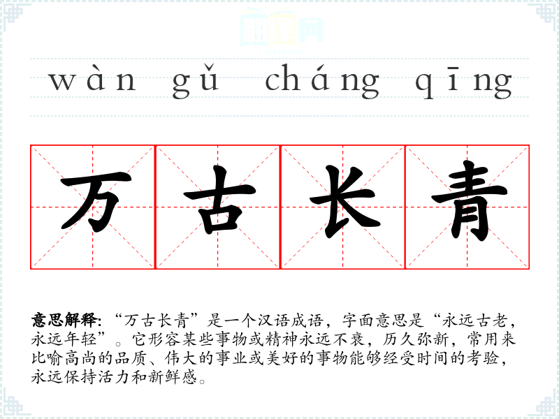 “万古长青”是一个汉语成语,字面意思是“永远古老,永远年轻”。它形容某些事物或精神永远不衰,历久弥新,常用来比喻高尚的品质、伟大的事业或美好的事物能够经受时间的考验,永远保持活力和新鲜感。