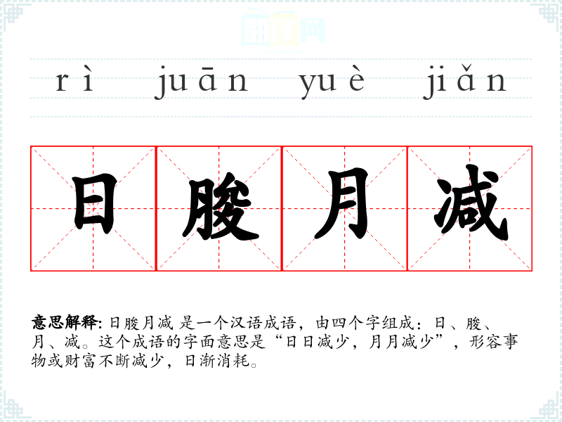 日朘月减 是一个汉语成语,由四个字组成:日、朘、月、减。这个成语的字面意思是“日日减少,月月减少”,形容事物或财富不断减少,日渐消耗。
