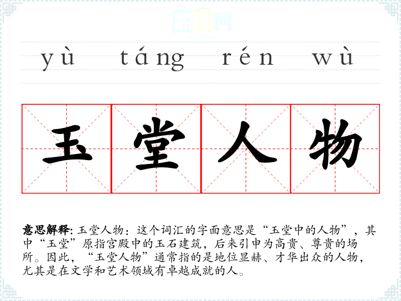 玉堂人物:这个词汇的字面意思是“玉堂中的人物”,其中“玉堂”原指宫殿中的玉石建筑,后来引申为高贵、尊贵的场所。因此,“玉堂人物”通常指的是地位显赫、才华出众的人物,尤其是在文学和艺术领域有卓越成就的人。
