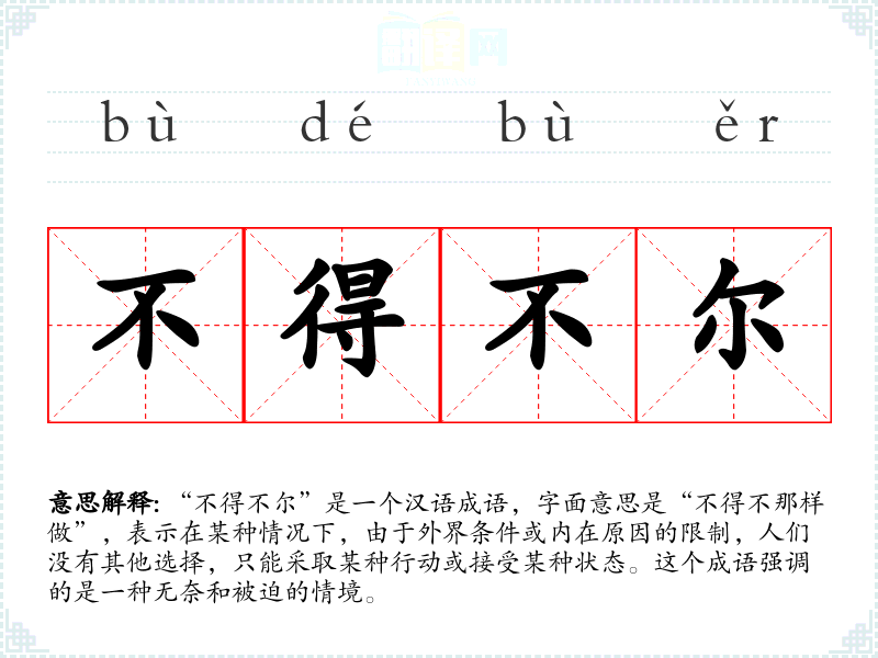 “不得不尔”是一个汉语成语,字面意思是“不得不那样做”,表示在某种情况下,由于外界条件或内在原因的限制,人们没有其他选择,只能采取某种行动或接受某种状态。这个成语强调的是一种无奈和被迫的情境。