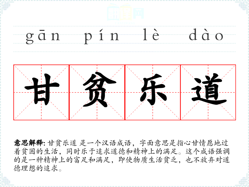 甘贫乐道 是一个汉语成语,字面意思是指心甘情愿地过着贫困的生活,同时乐于追求道德和精神上的满足。这个成语强调的是一种精神上的富足和满足,即使物质生活贫乏,也不放弃对道德理想的追求。