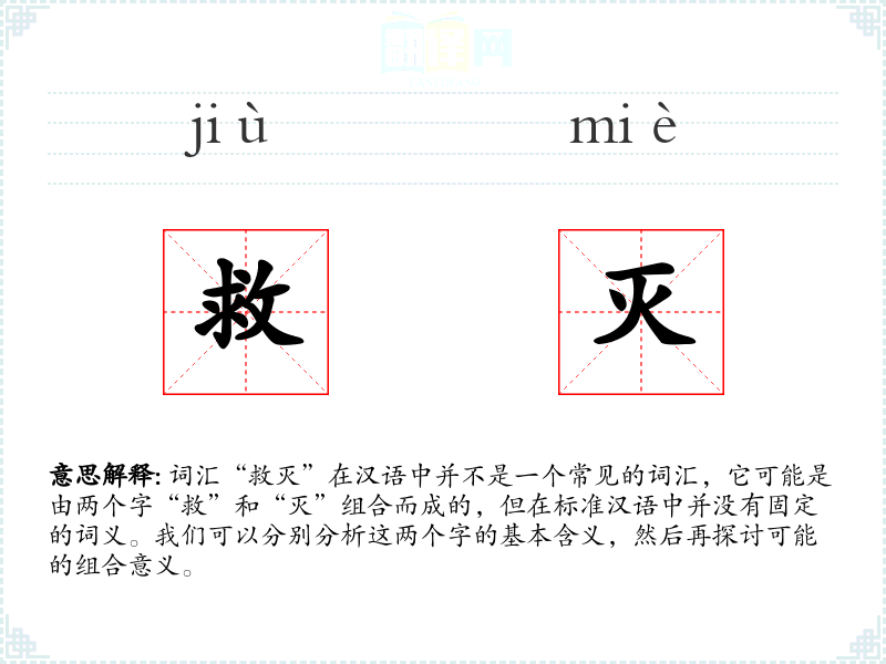 词汇“救灭”在汉语中并不是一个常见的词汇,它可能是由两个字“救”和“灭”组合而成的,但在标准汉语中并没有固定的词义。我们可以分别分析这两个字的基本含义,然后再探讨可能的组合意义。