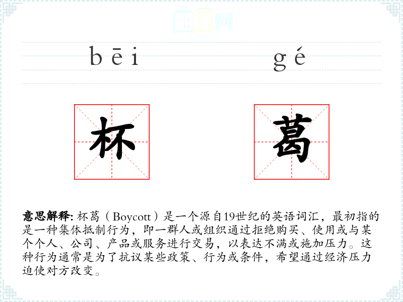 杯葛(Boycott)是一个源自19世纪的英语词汇,最初指的是一种集体抵制行为,即一群人或组织通过拒绝购买、使用或与某个个人、公司、产品或服务进行交易,以表达不满或施加压力。这种行为通常是为了抗议某些政策、行为或条件,希望通过经济压力迫使对方改变。