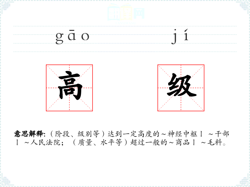(阶段、级别等)达到一定高度的~神经中枢丨 ~干部丨 ~人民法院; (质量、水平等)超过一般的~商品丨 ~毛料。