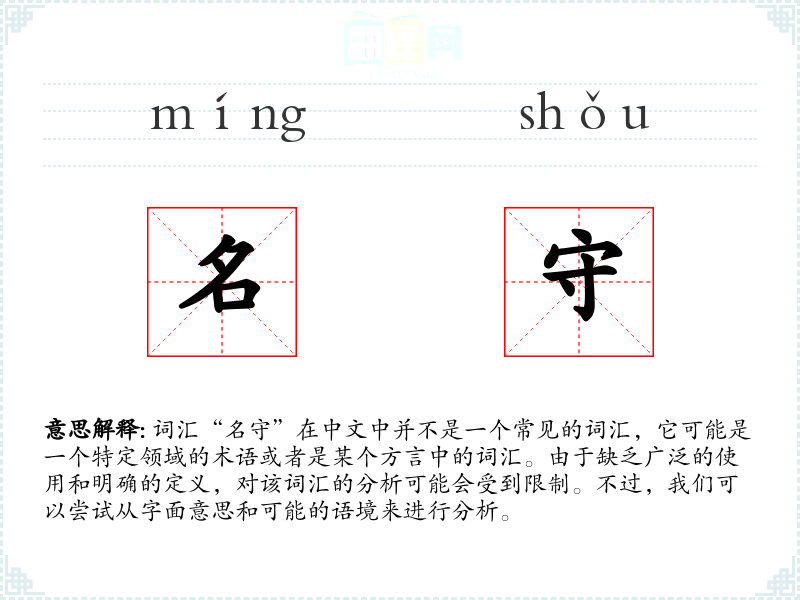 总的来说,“名守”是一个不太常见的词汇,其含义可能与守护名誉或名声相关。由于缺乏广泛的使用和明确的定义,对该词汇的分析可能会受到限制。在语言学习和表达中,了解这样的词汇可以帮助我们更好地理解特定语境下的表达方式。