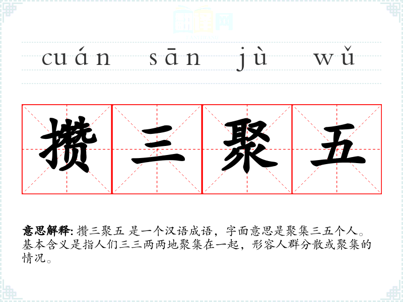 攒三聚五 是一个汉语成语,字面意思是聚集三五个人。基本含义是指人们三三两两地聚集在一起,形容人群分散或聚集的情况。