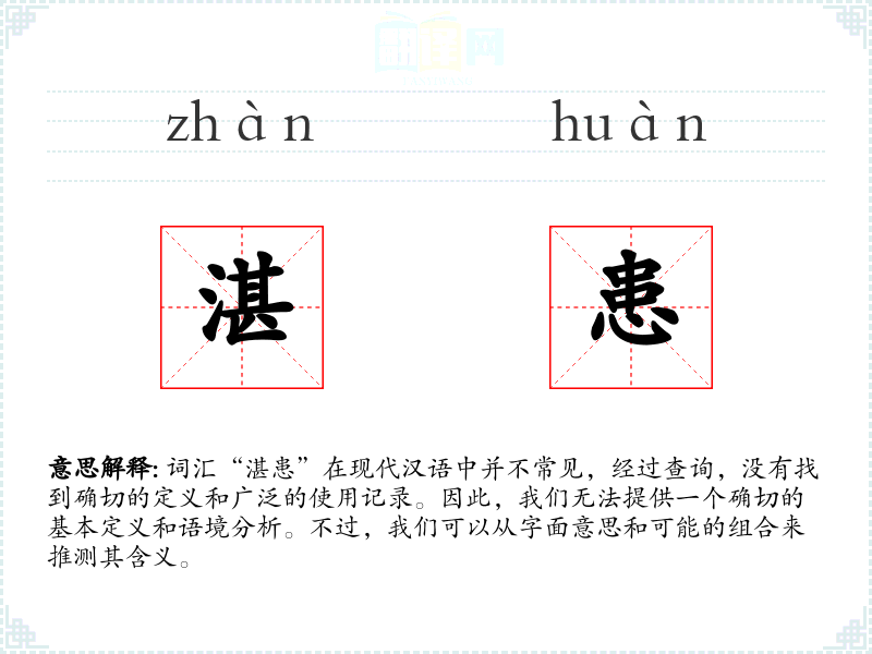 文化与社会背景: 由于“湛患”不是一个常用词汇,我们无法分析它在特定文化或社会背景中的意义和影响。