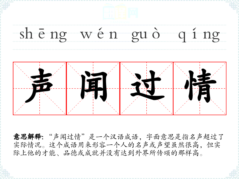 “声闻过情”是一个汉语成语,字面意思是指名声超过了实际情况。这个成语用来形容一个人的名声或声望虽然很高,但实际上他的才能、品德或成就并没有达到外界所传颂的那样高。
