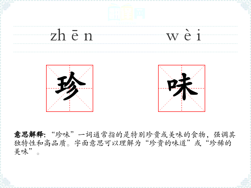 - 文学:在文学作品中,“珍味”常用来形容那些难得一见的佳肴,增添故事情节的奢华感或特殊性。